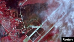 На снимках аэродрома Саки близ поселка Новофёдоровка видны сгоревшие 9 августа самолеты и авиационная техника на стоянке, а также большие участки выжженной территории.
